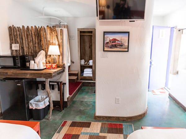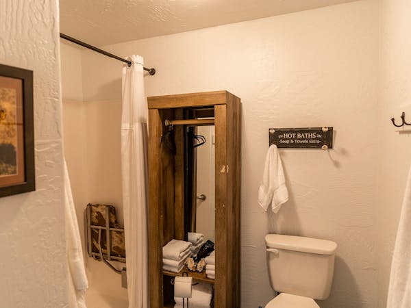 Room 12.5, the "Top Hand Room", honors the heroes of Canadian's heritage; King Room, orginal 1940s Ranch Oak table and chairs, barn slider door, two bath with tin Shower and rock floor.