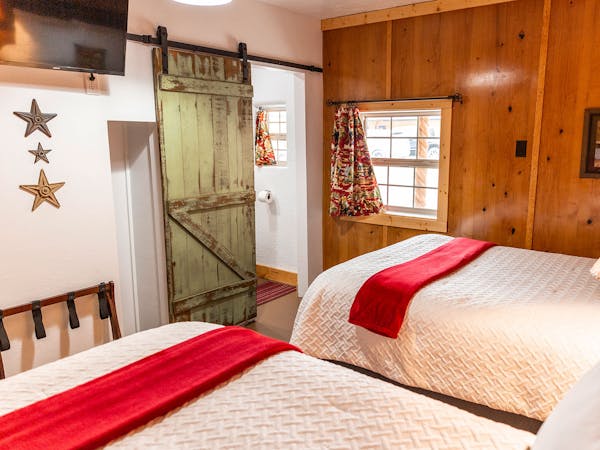 Room 12 with its rustic iron headboard on the Queen Bed, Texas Flag and bucking chute barn door to the bath honors Canadian't rodeo heritage as home of the World's First Public Rodeo. With cowhides on the floor and rodeo pictures on the wall the decor is fun for everyone and a must for fans of our first and always popular, 132 year old 3 day 4th of July Celebration and Rodeo. Luxury linens and a tin shower with rock floor complete this room with adjoins room 12 1/2 and may be used together or completely closed off for privacy.