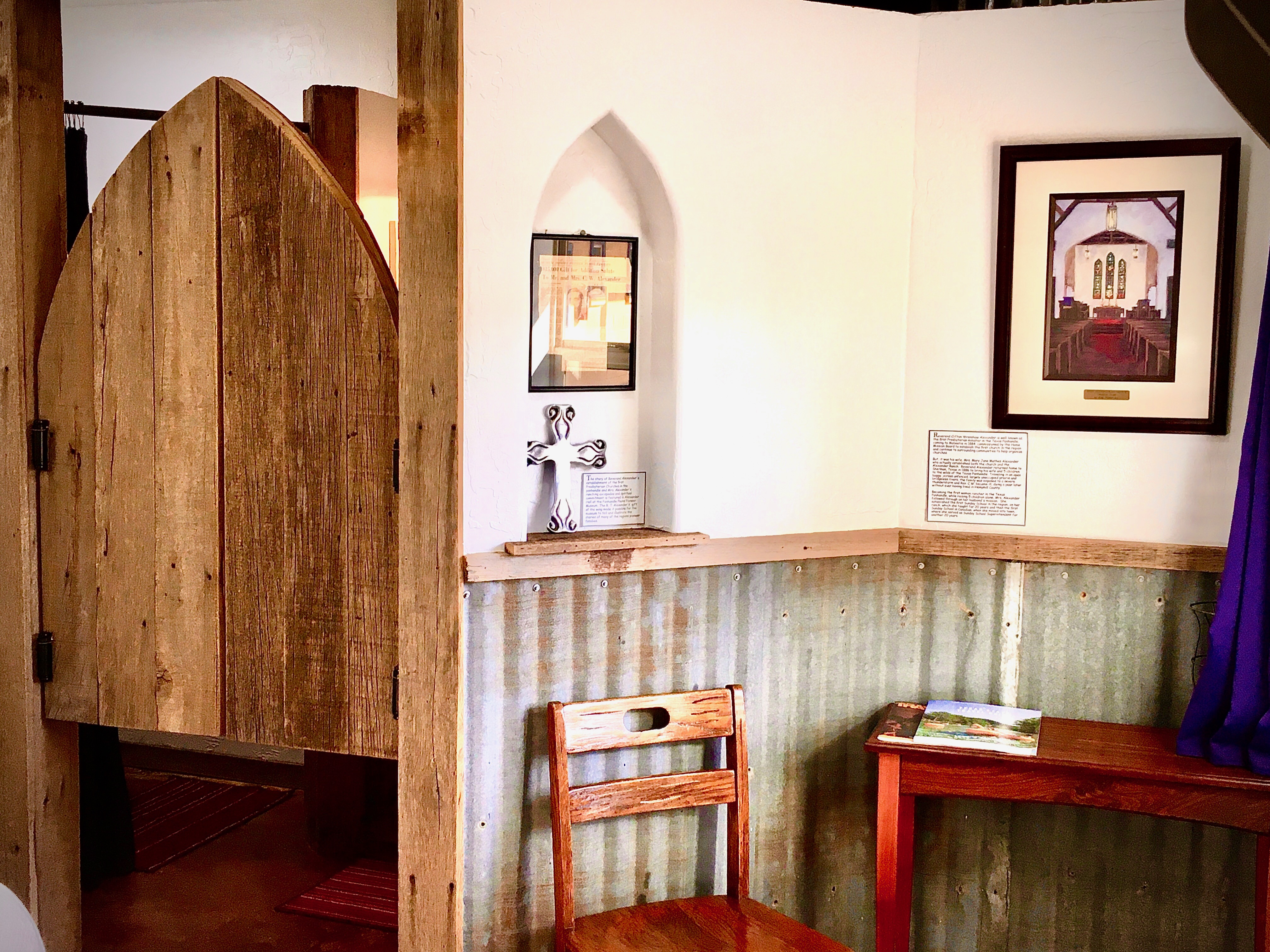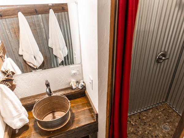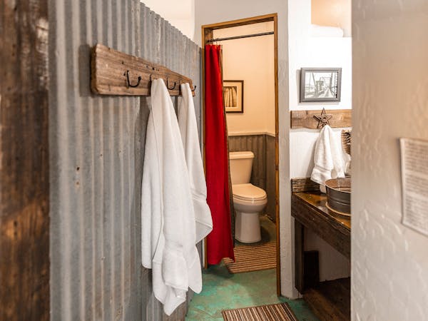 Also referred to as the Church Room, Room 10, features the gothic window shaped swinging doors common to both our first churches, and the popular saloons fo the time, while telling the story of Mrs. Mary Jane Alexander, who as a young widow with 5 children defied the traditions of the time and carried out her husband's mission to establish the 1st Presbyterian Church in the region, after shocking everyone by continuing on to Hemphill County, filing on land on the Washita River and becoming the 1st female landwoner, and rancher, in the Panhandle. In addition to its architectural nod to our churches, the room offers a Queen bed, with luxury bedding, rustic tin wainscoting and a small desk area. The bath features a bucket sink and tin shower with rock floor.