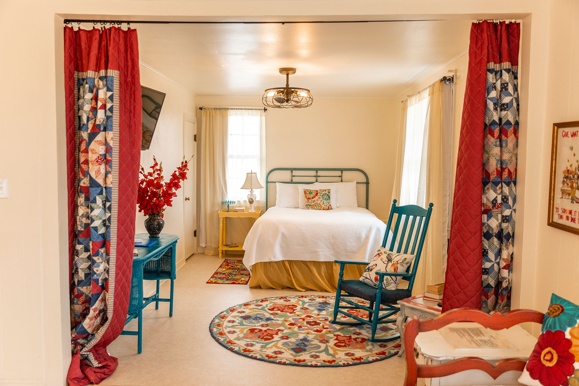 Captain Arrington was the first Ranger in the Texas Panhandle, providing law enforcement from the ranch he established near Canadian. His colorful story and the family ranch heritage are reflected in Room 6, where an old fashioned brass bed, luxury linens and walk or roll-in shower guarantee a peaceful night in this spacious handicap-accessible room.