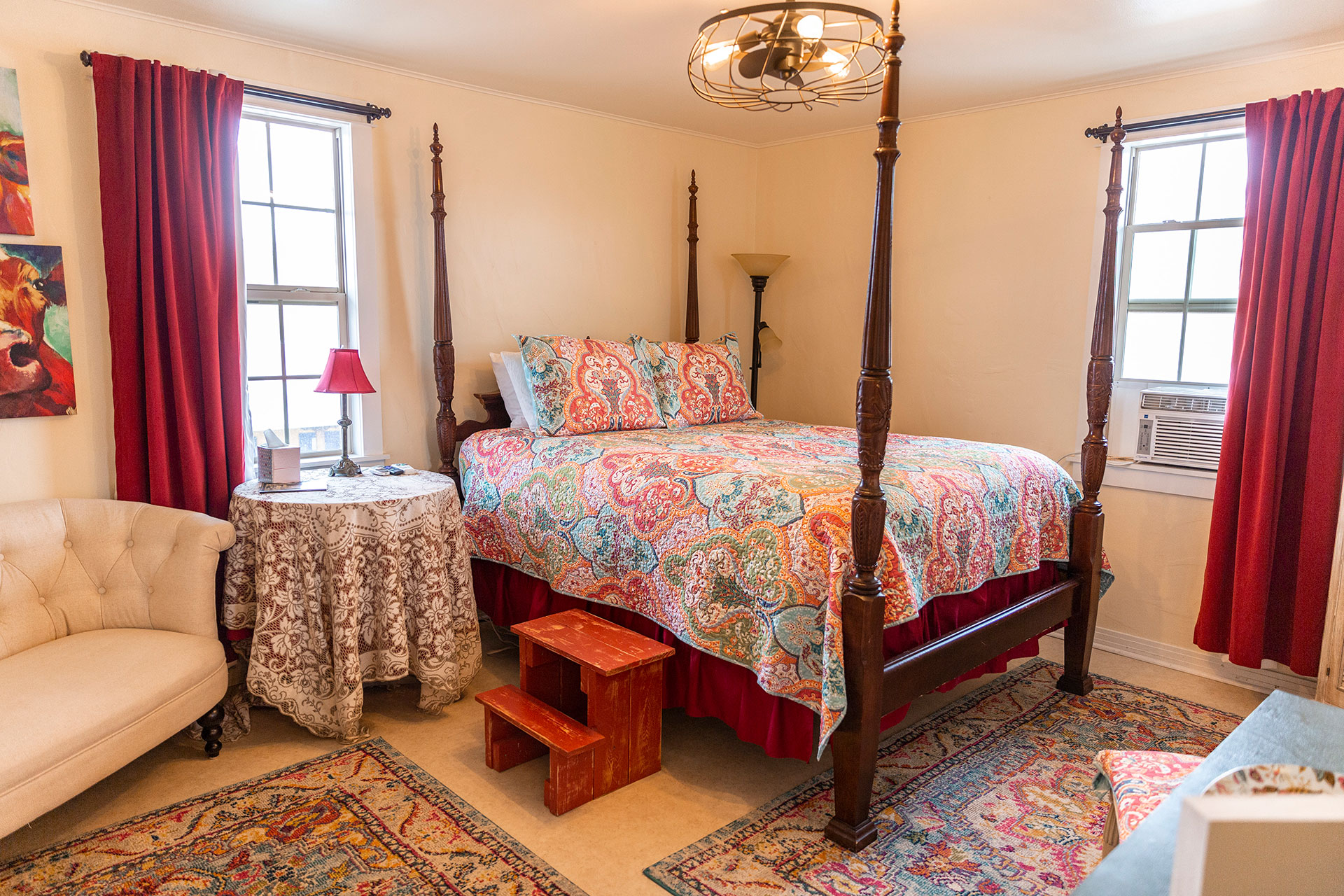 Hemphill County's other river, the Washita, is the nexus of our cowboy and Indian heritage, home first to the Kiowa and Comanche, then the Calvary on the old Military trail, followed by the earliest ranchers. the room's art reflects the peaceof the meandering river, the wild country surrounding it and the inevitable clash of cultures, while providing all the comforts of and old-time ranch house. The authenic ranch oad king bed is made up with luxury linens, while locally crafted Soak Yer Bones bath salts and the old fashioned cast iron soaking tub, invite you to get out of the saddle and relax a while.