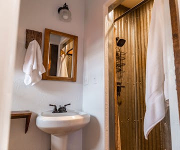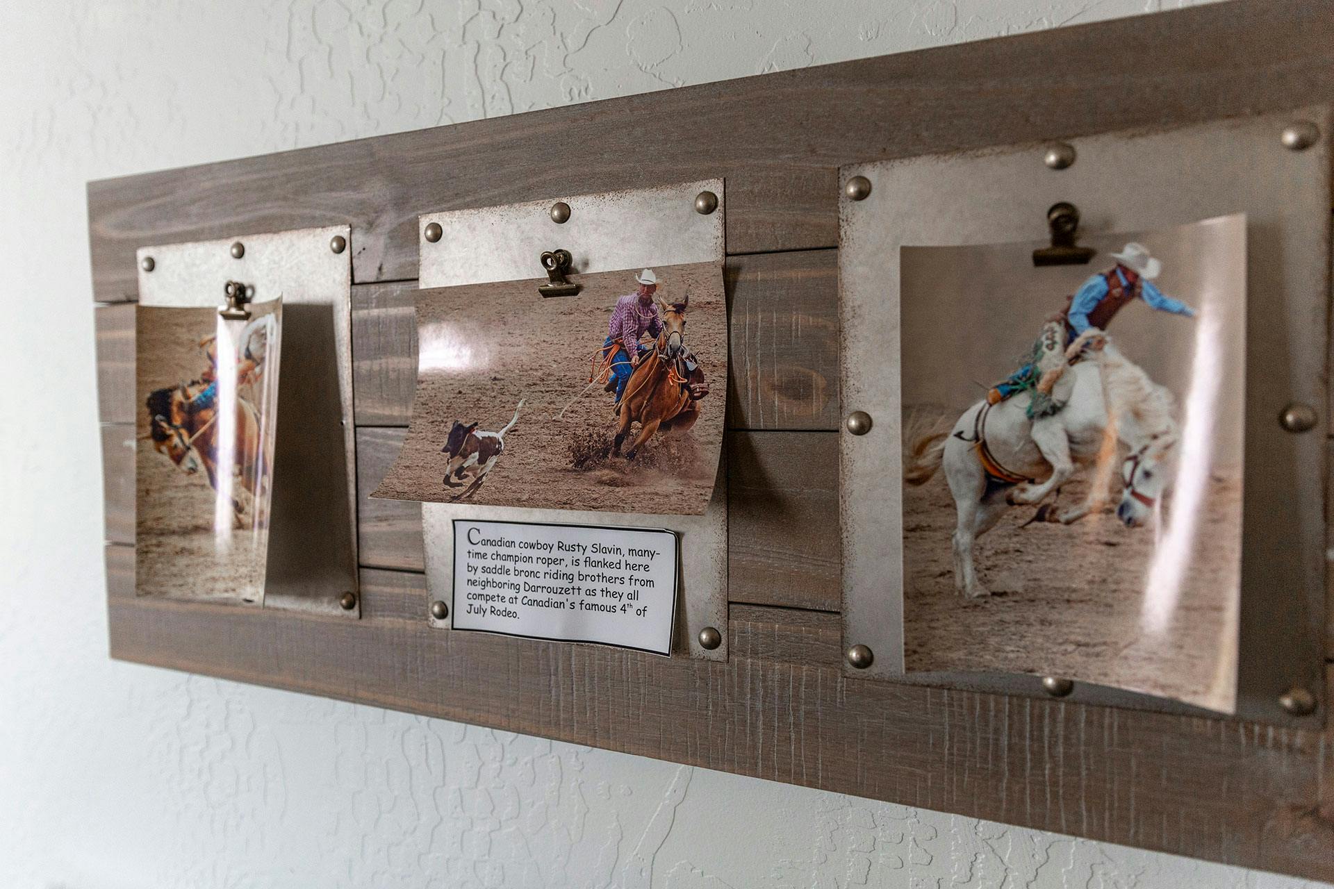 Room 12 with its rustic iron headboard on the Queen Bed, Texas Flag and bucking chute barn door to the bath honors Canadian't rodeo heritage as home of the World's First Public Rodeo. With cowhides on the floor and rodeo pictures on the wall the decor is fun for everyone and a must for fans of our first and always popular, 132 year old 3 day 4th of July Celebration and Rodeo. Luxury linens and a tin shower with rock floor complete this room with adjoins room 12 1/2 and may be used together or completely closed off for privacy.
