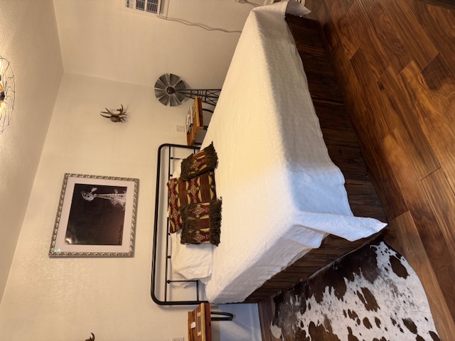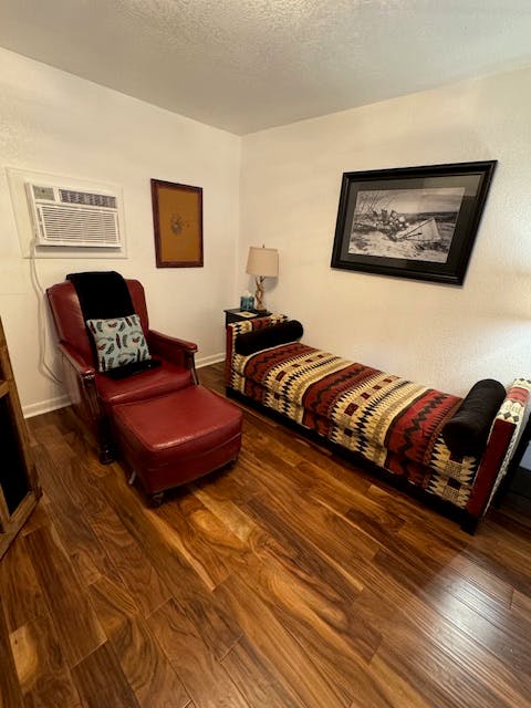 Also known as the Isaacs Room. They arrived in 1887. It is a nod to our first pioneer family's arrival to this arid place whose water supply comes from our underground aquifer the Ogallala. It is our regions finest blessing. It is a King Suite with 2 bathrooms a sleeping sofa and a recliner. It's beautiful doors and intriguing windmill photos, mostly taken by our friend and local photographer Beto Guillen, set the stage for a great nights rest.