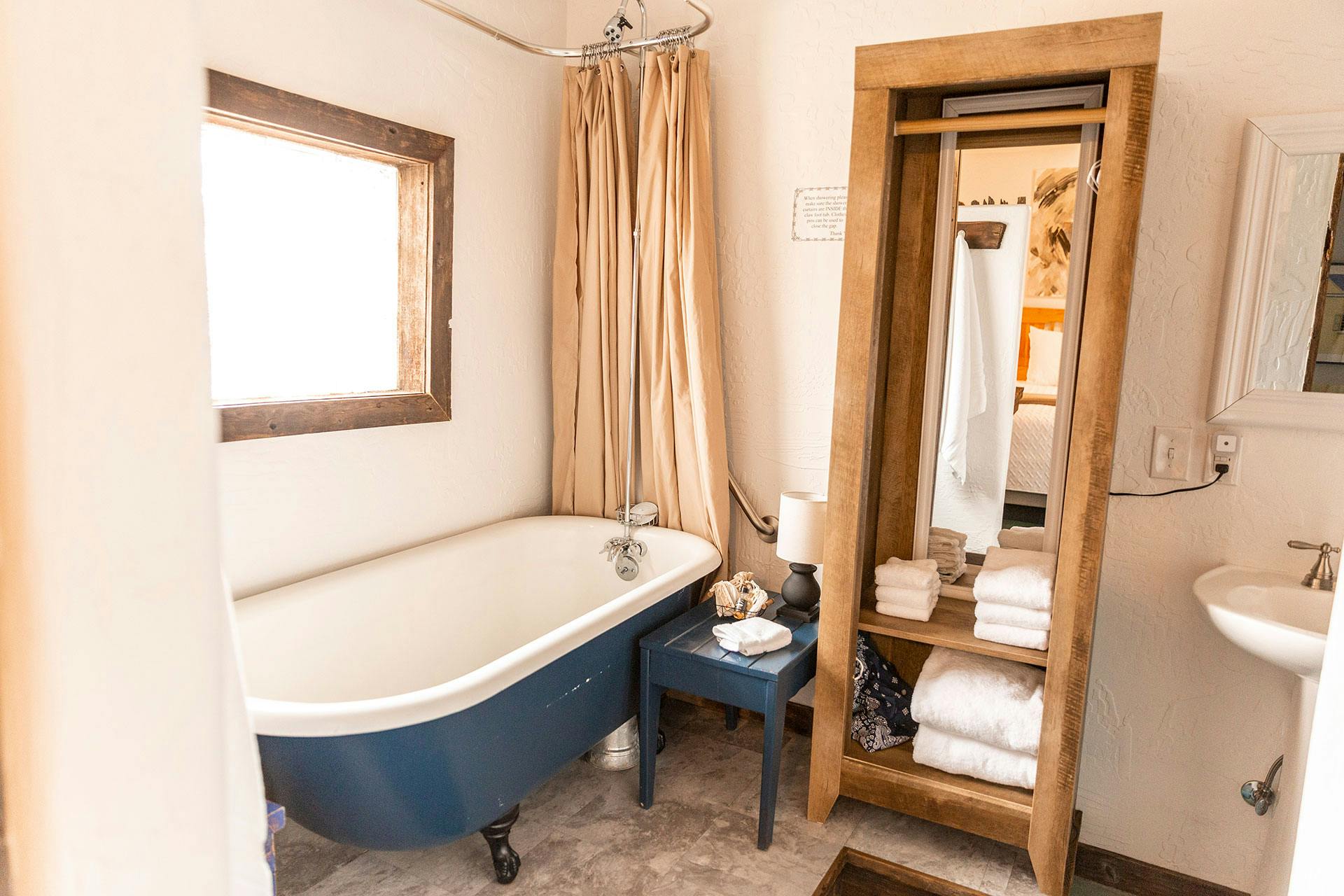 Hemphill County's other river, the Washita, is the nexus of our cowboy and Indian heritage, home first to the Kiowa and Comanche, then the Calvary on the old Military trail, followed by the earliest ranchers. the room's art reflects the peaceof the meandering river, the wild country surrounding it and the inevitable clash of cultures, while providing all the comforts of and old-time ranch house. The authenic ranch oad king bed is made up with luxury linens, while locally crafted Soak Yer Bones bath salts and the old fashioned cast iron soaking tub, invite you to get out of the saddle and relax a while.