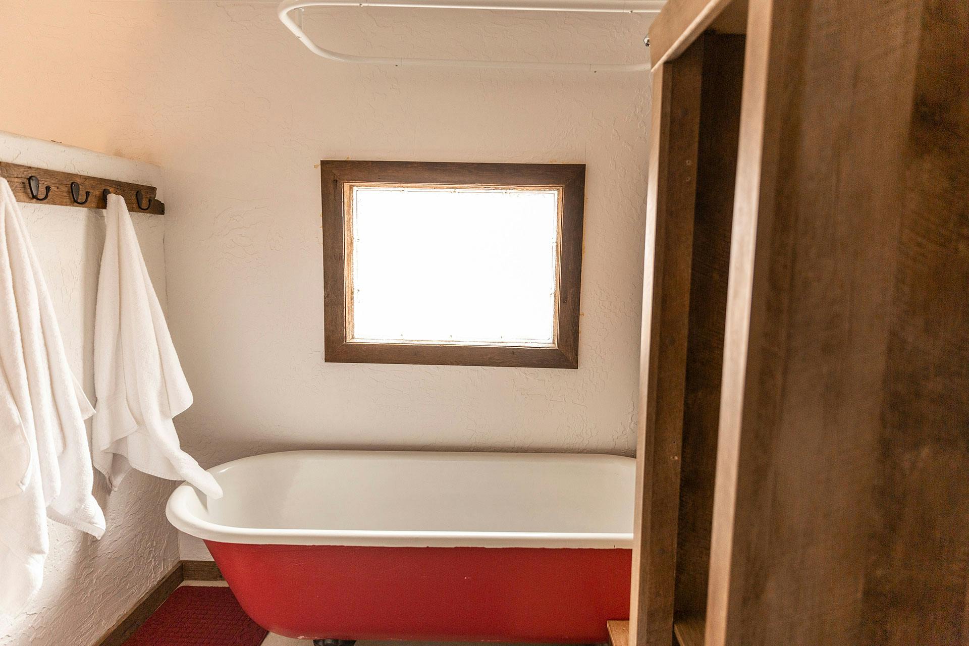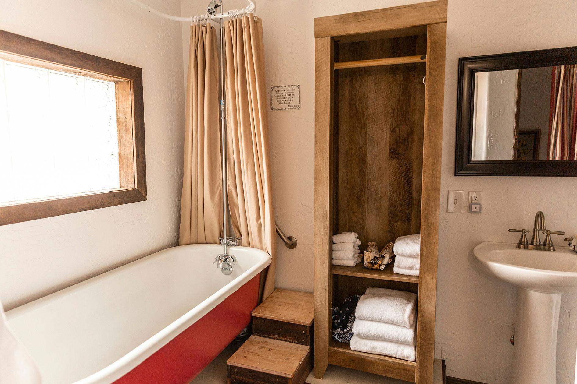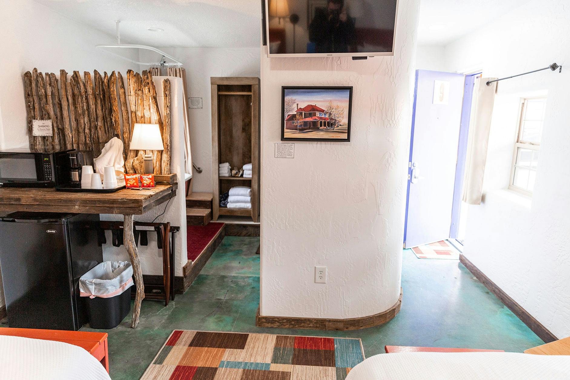 The history of the Brainard fmaily and ranch, in Hemphill County since 1886, parallels, intersects, winds around and tell the story of the Canadian, its heritage of family ranches, working cowboys, rancher turned business entrepreneur and 140 yrear of holding on, developing new and building better. Decor in this room with two double beds, our signature luxury linens, and six foot cast iron soaker tub features art reflecting the many firsts the 5 generation family brought to Canadian, development of the Hereford cattle breed, the orgination of the Southwestern Stockmen's Association, the first and only building owned and maintained by a local Women's Christian Temperance Union, now Canadian's library, ther rist of the ranch town home's that today are still teh highight of Canadian's historic tours.